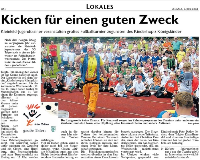Nach dem riesigen Erfolg im vergangenen Jahr veranstalten die Kleinfeld-Jugendtrainer der SG Telgte auch in diesem Jahr wieder ein Fußballturnierwochenende. Das Motto lautet diesmal "Kleine Helden - große Taten".