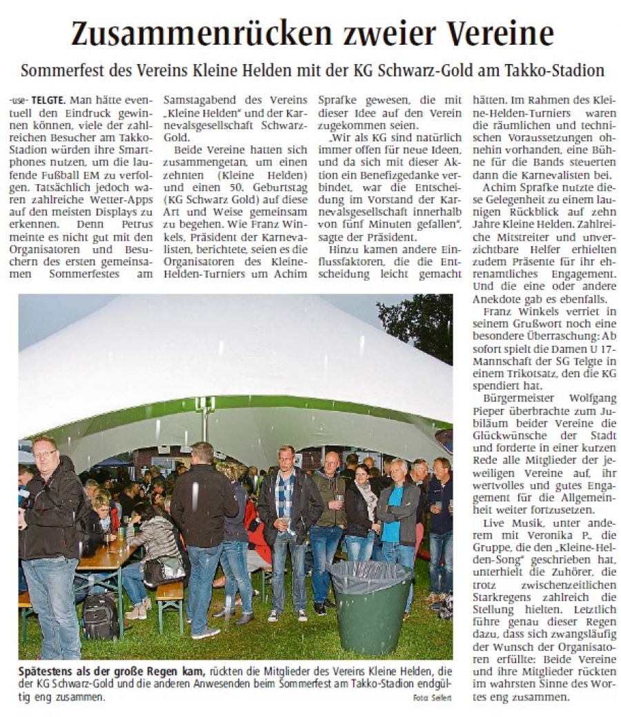 Beide Vereine hatten sich zusammengetan, um einen zehnten (Kleine Helden) und einen 50. Geburtstag (KG Schwarz Gold) auf diese Art und Weise gemeinsam zu begehen. Wie Franz Winkels, Präsident der Karnevalisten, berichtete, seien es die Organisatoren des Kleine-Helden-Turniers um Achim Sprafke gewesen, die mit dieser Idee auf den Verein zugekommen seien.